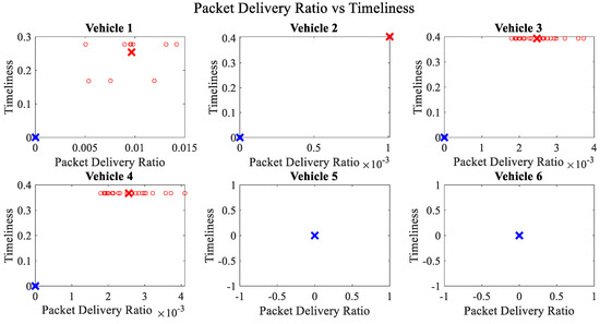Clustering for labels using unsupervised learning for packet delivery ratio vs. timeliness for vehicles 1−6. The cluster in blue represents untrustworthy vehicles, whereas the cluster in red depicts trustworthy vehicles. The rather empty results for vehicle 5 and vehicle 6 demonstrate that both vehicles have zero values for packet delivery ratio and timeliness with all other vehicles.