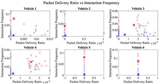 Clustering for labels using unsupervised learning for packet delivery ratio vs. interaction frequency for vehicles 1−6. The cluster in blue represents untrustworthy vehicles, whereas the cluster in red depicts trustworthy vehicles.