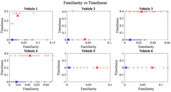 Clustering for labels using unsupervised learning for familiarity vs. timeliness for vehicles 1−6. The cluster in blue represents untrustworthy vehicles, whereas the cluster in red depicts trustworthy vehicles.