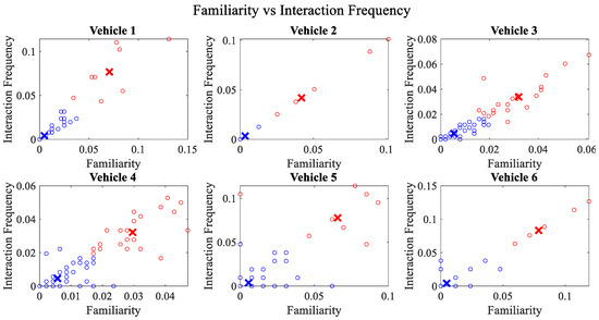 Clustering for labels using unsupervised learning for familiarity vs. interaction frequency for vehicles 1−6. The cluster in blue represents untrustworthy vehicles, whereas the cluster in red depicts trustworthy vehicles.
