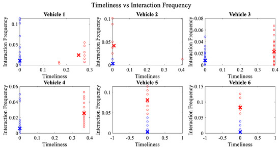 Clustering for labels using unsupervised learning for timeliness vs. interaction frequency for vehicles 1−6. The cluster in blue represents untrustworthy vehicles, whereas the cluster in red depicts trustworthy vehicles.
