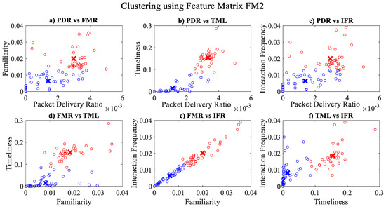 Clustering for labels using unsupervised learning on FM2: (a) packet delivery ratio vs. familiarity; (b) packet delivery ratio vs. timeliness; (c) packet delivery ratio vs. interaction frequency; (d) familiarity vs. timeliness; (e) familiarity vs. interaction frequency; (f) timeliness vs. interaction frequency; the cluster in blue represents untrustworthy vehicles, whereas the cluster in red depicts trustworthy vehicles.