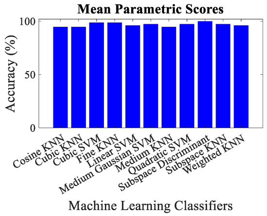 Classification accuracy for mean parametric scores using different machine learning classifiers.