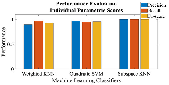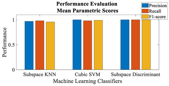 The overall accuracy, malicious node classification accuracy, precision, recall, F1-score and decision boundary using each feature matrix for each classifier have been computed for performance evaluation purposes. Simulation results revealed that the classification via mean parametric scores yielded more accurate results, as shown in Figure 9 in contrast to the one which takes into account the parametric score of each trustor for a trustee on an individual basis, as shown in Figure 10. It could be observed that the minimum overall classification accuracy while taking mean parametric score is yielded by Cosine KNN, Cubic KNN and Medium KNN as 94.7%, whereas while using individual parametric scores, the minimum overall classification accuracy is yielded by Cubic KNN and Subspace Discriminant and is found to be 88.2%. It is noteworthy that only the lowest accuracies have been mentioned here to emphasize the effectiveness of the proposed trust management scheme. It is also pertinent to highlight that the best malicious vehicle classification result of the proposed trust management model is yielded by taking the mean parametric scores and via Subspace Discriminant.