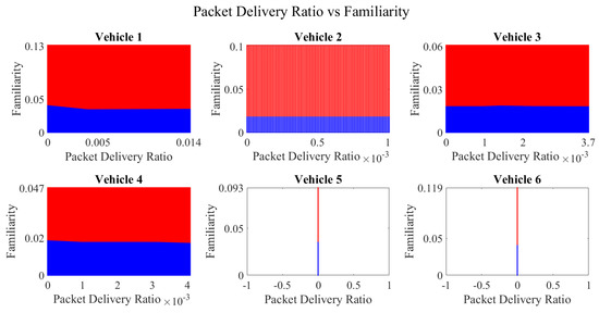 Decision boundary for packet delivery ratio vs. familiarity for vehicles 1−6. Boundary for untrustworthy vehicles is depicted in blue, whereas red manifests the trustworthy vehicles’ region.
