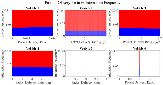 Decision boundary for packet delivery ratio vs. interaction frequency for vehicles 1−6. Boundary for untrustworthy vehicles is depicted in blue, whereas red manifests the trustworthy vehicles’ region.