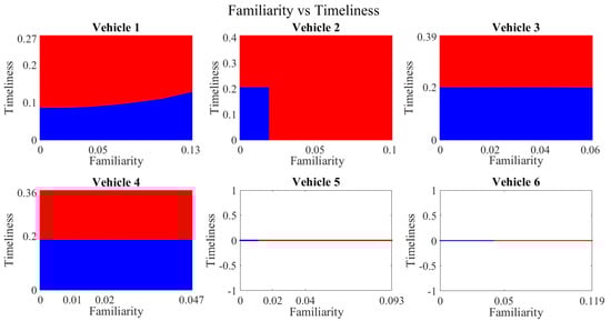 Decision boundary for familiarity vs. timeliness for vehicles 1−6. Boundary for untrustworthy vehicles is depicted in blue, whereas red manifests the trustworthy vehicles’ region.