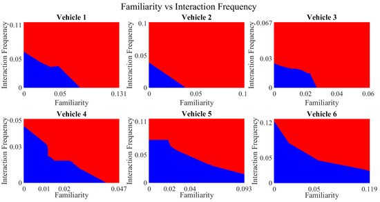 Decision boundary for familiarity vs. interaction frequency for vehicles 1−6. Boundary for untrustworthy vehicles is depicted in blue, whereas red manifests the trustworthy vehicles’ region.