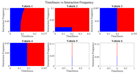 Decision boundary for timeliness vs. interaction frequency for vehicles 1−6. Boundary for untrustworthy vehicles is depicted in blue, whereas red manifests the trustworthy vehicles’ region.