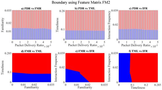 Decision boundary for: (a) packet delivery ratio vs. familiarity; (b) packet delivery ratio vs. timeliness; (c) packet delivery ratio vs. interaction frequency; (d) familiarity vs. timeliness; (e) familiarity vs. interaction frequency; (f) timeliness vs. interaction frequency; boundary for untrustworthy vehicles is depicted in blue, whereas red manifests the trustworthy vehicles’ region.