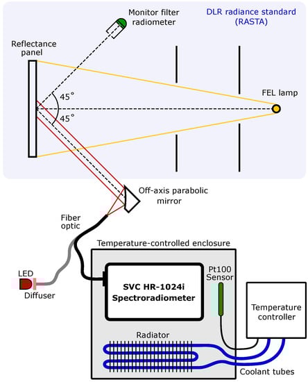 Radiometric response calibration setup of the spectroradiometer on the DLR radiance standard (RASTA). The calibrated radiance from a reflectance panel illuminated by an FEL lamp is monitored by five filter radiometers, but only one radiometer is shown in the sketch for clarity. The spectroradiometer is calibrated inside a temperature-controlled enclosure where the air temperature is maintained by a radiator and monitored by a Pt100 temperature sensor connected to a temperature-controller. The fiber optic bundle from the spectroradiometer is attached to an off-axis parabolic mirror that reduces the spectroradiometer’s field of view to approximately 4. The spectroradiometer’s field of view is aligned to the center of the RASTA reflectance panel with the off-axis parabolic mirror. This is aligned before the radiometric calibration by coupling the light from a diffused LED source into the fiber optic instead of the spectroradiometer.