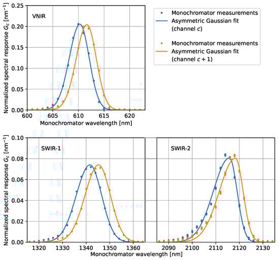 Equation (3) shows that the SRF for each channel is obtained by scanning the monochromator wavelength, as illustrated in Figure 2. The normalized SRF is parameterized with an asymmetric Gaussian function [19]: