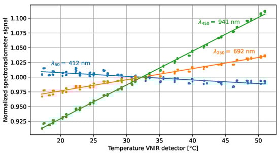 Temperature sensitivity measurements and linear fits of three channels in the VNIR detector array of the spectroradiometer. The spectroradiometer signals have been normalized to the response at a reference detector temperature of 32.3 °C. The labels indicate the center wavelength of the plotted channel.