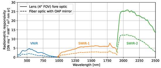 In this equation, is the radiometric responsivity of a channel c in units of DN mW ms m nm sr. The responsivity depends on the fore-optic installed on the spectroradiometer and is determined from calibration measurements with the DLR radiance standard at specific integration times for each detector array. Because the VNIR detector is not temperature-stabilized, its response changes with the instrument’s operating temperature. This effect is modeled as a linear relation in Equation (1) with the difference of the detector temperature with respect to the reference temperature of the detector during the radiometric calibration, where is the temperature sensitivity coefficient. The normalized spectral response function (SRF) with the center wavelength for each channel is determined from monochromator measurements as will be discussed in Section 4.