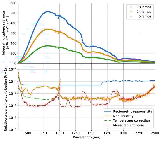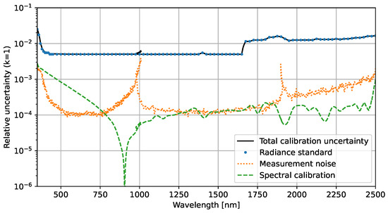Each of the uncertainty contributions of Equation (8) is also plotted in Figure 12. Again, the radiometric calibration uncertainty is the dominant contribution for the majority of the spectroradiometer channels. The non-linearity uncertainty is only for the VNIR detector array significantly larger than the measurement noise and exceeds the radiometric responsivity uncertainty at wavelengths below 380 nm and around 1000 nm. For the wavelength range from 380 nm to 2500 nm, the relative expanded uncertainty () of this radiance measurement is between 1% and 3%.