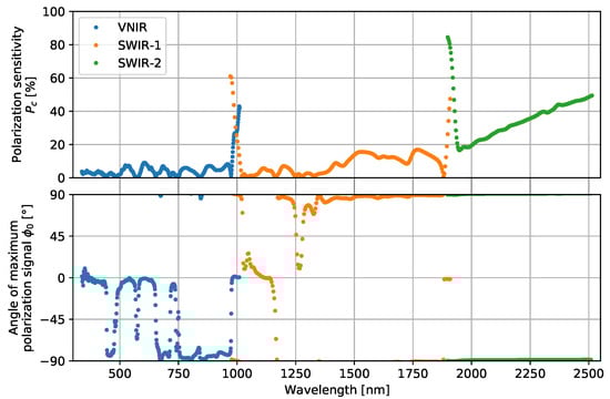 where is the signal mean, is the polarization-dependent response, and is the polarization angle at which the spectroradiometer has its maximum signal. The relative polarization sensitivity of the spectroradiometer is then quantified as . The results of fitting each channel with Equation (6) are plotted in Figure 10. While polarization sensitivity is observed over the entire wavelength range of the spectroradiometer, the largest sensitivities are at the wavelengths where the channels between detector arrays overlap.