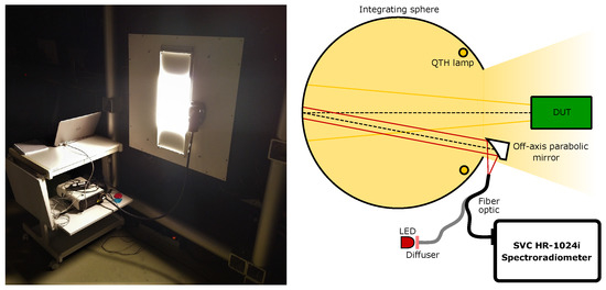 The calibrated spectroradiometer can be applied to measure the radiance from an homogeneous source using the parameters determined in the previous measurements. An example of such a radiance transfer measurement to a large-aperture integrating sphere is shown in Figure 11. The integrating sphere is here the source for radiometric calibrations of a device under test (DUT), where the spectral radiance from the integrating sphere aperture is determined from the simultaneous measurements with the spectroradiometer. The FOV of the spectroradiometer is aligned with the same method described in Section 2 to measure the radiance from the integrating sphere wall that is opposite the center of the rectangular aperture.