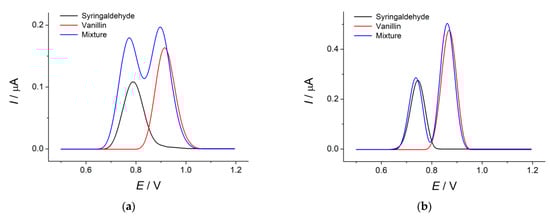 Baseline-corrected differential pulse voltammograms of 10 µM syringaldehyde, vanillin, and their mixture: (a) at the bare GCE; (b) at the MWCNTs/GCE. The supporting electrolyte is Britton–Robinson buffer pH 2.0. Pulse amplitude is 50 mV, pulse time is 50 ms, and potential scan rate is 10 mV·s−1.