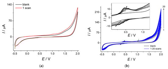 There is an irreversible oxidation step at 1.0 V in the cyclic voltammograms of p-ABA in Britton–Robinson buffer pH 2.0 (Figure 2a). This step corresponds to cation radical formation (Scheme 1). Oxidation currents are decreased as the number of cycles increase up to full disappearance, which agree well with the report [50]. On the other hand, the quasi-reversible redox pair at 450–500 mV appears on the second and following scans (Figure 2b). This pair transforms into two quasi-reversible redox pairs at 0.44/0.42 and 0.59/0.54 V after the fifth cycle (Figure 2b insert). Corresponding currents are increased with the increase in the number of cycles that confirms the formation of conductive polymeric coverage [36,50,51,52] according to Scheme 1.