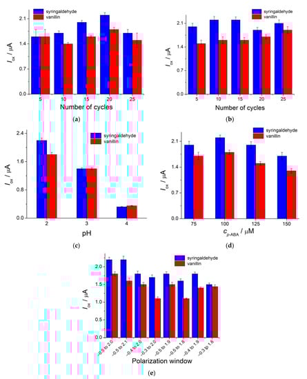 The concentration of the monomer and polarization window show a notable influence on the syringaldehyde and vanillin oxidation currents (Figure 3d,e). Varying the monomer concentration from 75 to 150 µM, significant changes in the oxidation currents of aldehydes are obtained while the currents ratio remains approximately the same. Maximal currents are achieved for 100 µM p-ABA (Figure 3d). The polarization window also affects the syringaldehyde and vanillin response (Figure 3e). The highest oxidation currents are observed on the poly(p-ABA) layer formed in the polarization window from −0.5 to 2.0 V. The narrowing and expansion of the potential range leads to a decrease in the oxidation currents of both aldehydes, which is probably caused by the completeness of the p-ABA electropolymerization at the electrode surface.