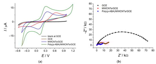 (a) Cyclic voltammograms of 1.0 mM ferrocyanide ions in 0.1 M KCl at the bare GCE, MWCNTs/GCE, and poly(p-ABA)/MWCNTs/GCE. The potential scan rate is 100 mV·s−1; (b) Nyquist plot (experimental (points) and fitted (lines)) for bare GCE, MWCNTs/GCE, and poly(p-ABA)/MWCNTs/GCE in the presence of 1.0 mM mixture of ferro-/ferricyanide ions in 0.1 M KCl. Polarization potential is 0.21 V, frequency range is 10 kHz—0.04 Hz, amplitude is 5 mV.