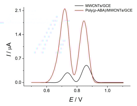Poly(p-ABA)/MWCNTs/GCE demonstrates electroactivity in the supporting electrolyte that agrees well with the report [36,50,51,52]. Two quasi-reversible redox pairs at 0.44/0.42 and 0.59/0.54 V are observed in the cyclic voltammograms in Britton–Robinson buffer pH 2.0 (Figure S1). A similar behavior has been reported in 0.1 M H2SO4 [52]. The capacitive currents for the polymer-modified electrode are significantly increased compared to MWCNTs/GCE, as Figure S1 shows.