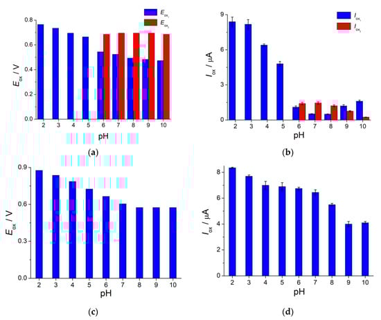 Oxidation potentials of both aldehydes decrease with the pH increase (Figure 7a,c) indicating proton participation in the electrode reaction. The absence of cathodic steps confirms the irreversibility of the aldehydes oxidation in the whole pH range. A split of the oxidation step and a redistribution of the oxidation currents are observed for the syringaldehyde at pH 6.0 and above (Figure 7a,b). pH-independent oxidation is observed in the basic medium, which agrees well with the dissociation constants (pKas are 7.09 for syringaldehyde [53] and 7.36 for vanillin [54]). Oxidation currents are decreased with increasing Britton–Robinson buffer pH that is caused by partial oxidation of the aldehydes with air oxygen, especially in neutral and basic medium that is typical for the phenolics [55]. Britton–Robinson buffer pH 2.0 is chosen for further investigation as providing the highest oxidation currents of both aldehydes.