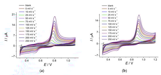 The electrooxidation parameters of aromatic aldehydes are evaluated using cyclic voltammetry at the various potential scan rates. There are well-defined oxidation peaks of syringaldehyde and vanillin in the whole range (5–250 mV·s−1) of potential scan rates studied (Figure 8). The oxidation potentials of aromatic aldehydes are anodically shifted with the increase in potential scan rate, indicating irreversibility of the electrooxidation that is also confirmed by the absence of cathodic steps on the voltammograms at low potential scan rates. The quasi-reversible redox pair belongs to the polymeric coverage (see Section 3.2.1). The oxidation currents are increased with the potential scan rate growth. The parameters of the corresponding linear plots are summarized in Table 3.