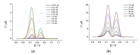 As known [47,48], the electrode surface modification with MWCNTs improves the voltammetric response of natural phenolics including vanillin. Therefore, the voltammetric behavior of syringaldehyde and vanillin at the MWCNTs/GCE is investigated. Oxidation peaks at 0.742 and 0.873 V are registered for syringaldehyde and vanillin, respectively (Figure 1b), i.e., a shift in the oxidation potentials to less positive values on 40 mV vs. GCE is achieved for both aldehydes. This effect confirms the increase in the electron transfer rate at the MWCNTs/GCE [49]. The oxidation currents are 2.2- and 2.6-fold increased for syringaldehyde and vanillin, respectively, which is caused by the larger effective surface area of the modified electrode. The peak potential separation of 131 mV is similar to that at the bare GCE. Nevertheless, two almost fully separated peaks at 0.742 and 0.863 mV are observed in the voltammograms of the aldehyde’s mixture (Figure 1b). However, the higher sensitivity of the response and better resolution of the oxidation peaks is required for the simultaneous determination of the aldehydes in real samples.