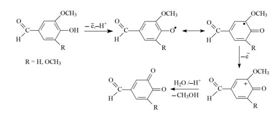 Thus, electrooxidation of aromatic aldehydes involves two electrons and protons and corresponds to the formation of o-quinones (Scheme 2) that agree well with the report in [26,60,61,62,63].