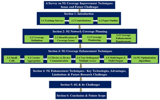 This article is organised as follows: Section 2 illustrates the basics of wireless communication system, i.e., coverage definitions, coverage issues, coverage monitoring, and coverage requirements. Section 3 focuses on the coverage enhancement technologies such as small cells, CA, D2D, NOMA, MIMO, and optimization in 5G networks. In this section, each coverage enhancement technique implementations and their future challenges are explored. In Section 4, 5G key parameter enhancement techniques, their advantages, limitation and future challenges are illustrated. 6G and its future challenges are explored in Section 5. Section 6 concludes the article and provides the future scope. The structure of this article is shown in Figure 1. Table 3 provides the list of abbreviations used in this article.