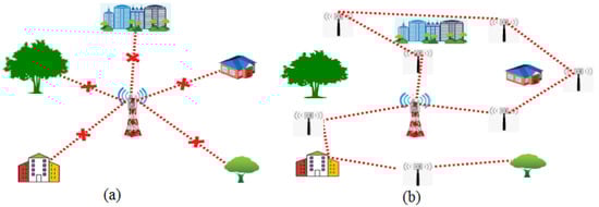 The mmWave, i.e., from 30 GHz to 300 GHz, is a much less utilised spectrum and it provides very high speed communication. However, the problem with high frequency mmWave is that it collides with obstacles such as trees, buildings, etc., in the free space, and causes multipath fading, which leads to reduced signal strength. Therefore, mmWaves are the best frequency bands for short distance communication and can be used in small cells. A geographical area without small cells and with small cells is shown in Figure 5. In Figure 5a, the mmWave signal is facing multipath fading but in Figure 5b, with the use of small cells, the multipath fading is avoided and it provides better coverage than compared to the conventional method.