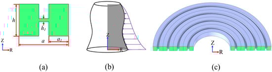 In this study, the proposed H-RPC structure is composed of centrosymmetric grooves, as shown in Figure 1. Figure 1a shows the H-RPC unit cell section diagram, Figure 1b shows the unit cell rotating around the z-axis diagram, and Figure 1c shows the three-dimensional H-RPC structure. The lattice constant , the total height , the left and right-side wall width , and the middle support beam height . Since the structure is obtained by rotating around the Z-direction, the irreducible Brillouin zone of the three-dimensional H-RPC is the Г-R region. The H-RPC is composed of commonly used anisotropic monocrystalline silicon. Among them, the density (ρ) is 2330 kg/m3, and the elastic modulus E of anisotropic single-crystal silicon, shear modulus G, and Poisson’s ratio σ are shown in Table 1.