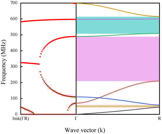 The complex band curve of the H-RPC structure is shown in Figure 2. In Figure 2, the real wave vector energy band curve in (Г-R) direction is represented by solid lines of different colors on the right side, and the imaginary wave vector energy band curve in (Г-R) direction is represented by red dotted lines on the left side. If there is a frequency range where no band curve is present in the real wave vector energy band curve, then this is a complete band gap. When the frequency is in the band gap range, the absolute value of the imaginary wave vector can be used to represent the attenuation characteristics in the band gap. The larger the absolute value of the imaginary wave vector, the stronger the attenuation. It can be seen from the figure that six real wave energy vector band curves are found in 0–700 MHz, and three complete band gaps are generated (as shown in the shadow on the right side of Figure 2). The first complete band gap is obtained at 44.3–58.7 MHz, which is generated between the first energy band curve and the second energy band curve. A second complete band gap is obtained at 209.4–489.7 MHz, which is generated between the third energy band curve and the fourth energy band curve. The third complete band gap is obtained at 508.3–615.8 MHz, which is generated between the fourth energy band curve and the sixth energy band curve. From the energy band curve of the imaginary wave vector, it can be observed that when the frequency is in the second band gap, the absolute value of the imaginary wave vector shows a continuous and stable change, which is mainly caused by the Bragg mechanism.