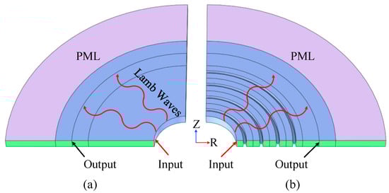 In order to verify the stopband effect of the radial structure a comparative analysis of different periodic models is established, and the frequency response curve (the transfer function is defined to be equal to , and and are respectively expressed as the acceleration of output and input) is used to measure the degree of the stopband. Specifically, the frequency response model is established as shown in Figure 3, while Figure 3a shows the traditional contrast propagation model and Figure 3b shows the H-RPC model with four cycles. As shown in Figure 3, an R-direction displacement excitation is applied to the input probe and the output probe is used to pick up the displacement results. In order to reduce the reflection of elastic waves and interfere with the propagation process, a perfect matching layer (PML) is set at both ends of the model.