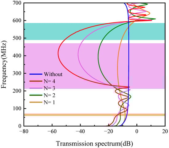 The frequency response curve is shown in Figure 4. In the first band gap (44.3–58.7 MHz), the frequency transmission response of the PnC model is lower than that of the comparison model. In the second band gap (209.4–489.7 MHz) and the third band gap (508.3–615.8 MHz), the model composed of PCs is significantly lower than the corresponding model. When the frequency is about 400 MHz, the maximum attenuation is 55 dB. When the frequency is in the first band gap range, the attenuation does not decrease significantly. This is because the wavelength of the elastic wave is much larger than the unit cell of the PnC when in the first band gap range. At this time, although the band gap appears in the band structure, it does not play a strong role in the simulation application. It is particularly noteworthy that with the increase of the period N, the attenuation in the second band gap and the third band gap will gradually increase. This is because with the increase of the period the elastic wave will be attenuated when passing through the PnC of each period.