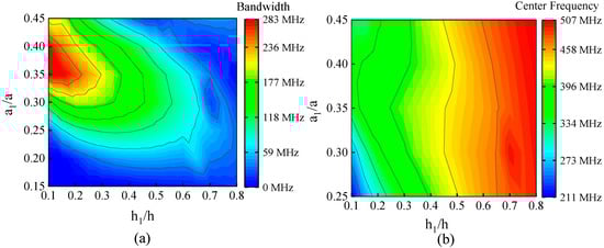 For the formation of an ultra-wide band gap, the geometric parameters of the unit cell play a fundamental role. Therefore, in this section, the influence of the geometric parameters and of the structure on the ultra-wideband gap is discussed. Under the condition of keeping the lattice constant a and height h unchanged, the influence of changing the value of and on the ultra-wideband gap is shown in Figure 5. In Figure 5, Figure 5a shows the variation of the bandwidth of the ultra-wideband gap with and , and Figure 5b shows the variation of the center frequency of the ultra-wideband gap with and . As increases, the band gap width gradually decreases to zero, and the center frequency of the band gap gradually shifts to high frequency. This is because as gradually increases, the propagation obstacle of the elastic wave at the connection boundary of the support beam decreases. With the increase of , the band gap width increases first and then decreases, and the band gap center frequency changes little. In particular, the change of will not only change the width of the band gap but also will change the stiffness of the supporting beam of the structure. The results show that when 0.1 < < 0.2 and 0.35 < < 0.40, the center frequency is in the UHF range and the bandwidth reaches more than 250 MHz.