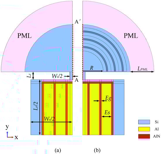 In addition, in order to further verify the effect of applying H-RPC resonators to reduce anchor loss, PCs periodic structures with different R (0 μm, 5 μm, 10 μm, and 15 μm) spacings are applied on the anchor of the resonator as shown in Figure 6. In this study, the simulation model of the resonator absorbs the dissipated elastic wave according to PML (). This study ignores other factors and only considers the main anchor loss factors []. The anchor quality factor () of the resonator can be obtained from []: