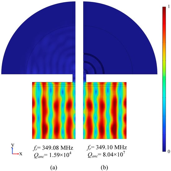 Figure 7 shows the modal diagram of the finite element simulation results. Figure 7a is the resonant mode of the conventional LWR. The resonant frequency is and . Figure 7b is the LWR mode diagram when R = 0μm after adding H-RPC. The resonant frequency is and . In addition, when R = 5 μm, the resonant frequency is 349.10 MHz and ; when R = 10 μm, the resonant frequency is 349.11 MHz and ; when R = 15 μm, the resonant frequency is 349.04 MHz and . The results show that the is significantly improved after adding H-RPC. When R = 0 μm, is increased to , which is 505560.4% higher than that of the conventional LWR.