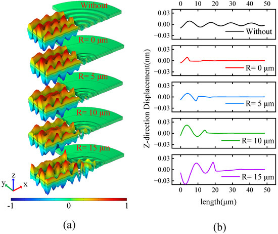 Figure 8 shows the result diagram of the resonator at the resonant frequency. Figure 8a represents the modal diagram of the resonator at the resonant frequency, and Figure 8b represents the displacement diagram of the resonator‘s section A-A‘ at the resonant frequency. From the Z-direction vibration mode diagram of the conventional LWR in Figure 8a, it can be seen that the elastic wave after the support tether radiates outward with ripples, and the elastic wave can be added after the H-RPC structure is added. It can be seen from Figure 8b that when R = 0 μm, the elastic wave has the greatest suppression effect before reaching the first wave peak; when R = 5 μm, the elastic wave has an effective suppression effect before reaching the first wave trough; when R = 10 μm, the elastic wave has an effective suppression effect after experiencing a periodic waveform, and it can be clearly observed that the waveform displacement of the first cycle is higher than without H-RPC the periodic waveform. It is worth noting that when R = 15 μm, the waveform displacement of the elastic wave is oppositely excited, and the reflected acoustic energy has a certain influence on the main resonant mode of the resonator. The results show that when H-RPC is closer to the support tether it is more conducive to suppressing the anchor loss of the resonator.