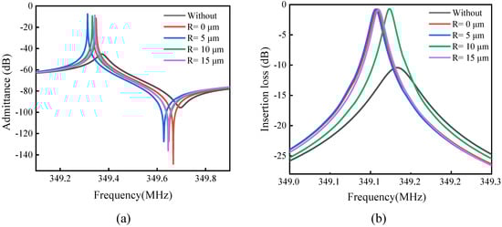 The results are shown in Figure 9, where Figure 9a shows the admittance curve Y11 and Figure 9b shows the insertion loss curve. Figure 9 contains the data results of conventional LWR results and different R values after adding the H-RPC. When using a conventional LWR, , , and insertion loss is 10.43 dB. After adding the H-RPC when R = 0 μm, , , and insertion loss is 0.74 dB; when R = 5 μm, , , and insertion loss is 0.80 dB; when R = 10 μm, , , and insertion loss is 0.72 dB; when R = 15 μm, , , and insertion loss is 0.81 dB. When R = 5 μm, the Q exhibits maximum improvement, increasing from 2773 to 9704, which is 249.9% higher than that of the conventional LWR. The electromechanical coupling coefficient of the LWR is between 0.17% and 0.18%, and the addition of the H-RPC has little effect on the electromechanical coupling coefficient. When R = 10 μm, the insertion loss decreases from 10.43 dB to 0.72 dB, which is 93.10% lower than that of the conventional LWR. The results show that the LWR with the H-RPC can increase the Q by up to 249.9%, and the insertion loss can be reduced by up to 93.10%. At the same time, the addition of the H-RPC has little effect on the electromechanical coupling coefficient of the LWR.