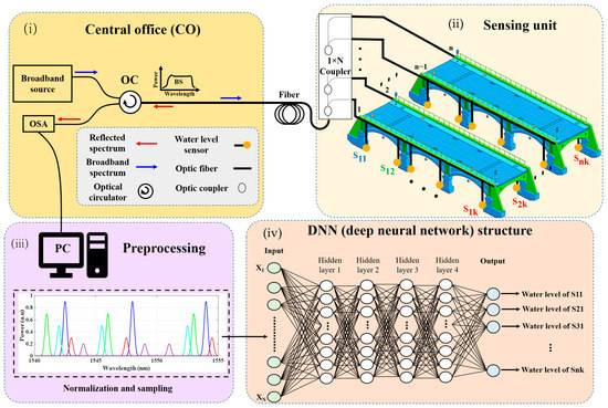 Scheme diagram of the proposed multiple-point liquid level sensing system, which consists of four main blocks: (i) central office, (ii) sensing unit which shows the IDWM liquid level sensing system, (iii) preprocessing unit, and (iv) deep neural network structure.