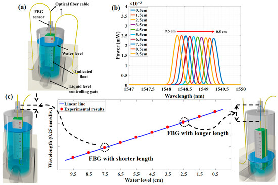 where ρε is the fiber’s photo-elastic coefficient and εm = ΔL/L is the mechanical strain and L is the length of FBG. Due to the dependence of the center wavelength on the strain, these structures can be employed as sensors that change in axial strain and will cause the Bragg wavelength shifts. To measure the liquid level, an FBG sensor was connected to the indicated float, as shown in Figure 2a. When the water level in the container changes, the float will move upward or downward, which causes axial strain and resulting a shift in the λB to the higher or lower wavelength.
