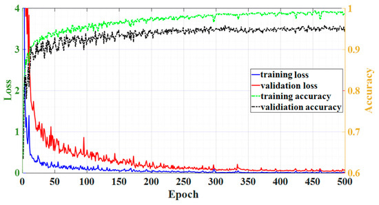 The DNN performance for the training and validation dataset is plotted in Figure 3. In Figure 3, the blue and red solid lines show the loss on the left axis for training and validation data, respectively, while the dashed green and black lines show the accuracy on the right axis. As shown in the figure, the training loss and validation loss converge at epoch 500 and it achieves a good performance at this epoch number. The optimal DNN parameters, including the learning factor, learning algorithm, and the number of neurons, are shown in Table 1. The number of neurons Є {32, 64, 128, …, 1024}, the number of hidden layers Є {2, 3, 4, …, 8}, and optimizer type Є {Adam, Adamax, RMSprop, SGD} values in Table 1 are derived by random search method, while other hyperparameters are chosen empirically.