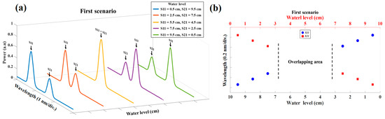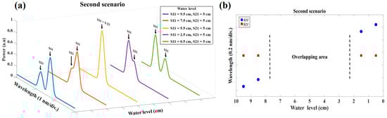 The experimental result of the reflected spectrum for five different water level steps for the first scenario when the water level in sensor S11 is 0.5 cm, 2.5 cm, 5.5 cm, 7.5 cm, and 9.5 cm is shown in Figure 4a. In this figure, the fully overlapping spectra can be observed in the third plot, which is impossible to measure the sensing signals of each sensor. Figure 4b depicts the water level of S11 and S21 versus their Bragg wavelength when the water level rises from 0.5 cm to 9.5 cm in the S21 but falls from 9.5 cm to 0.5 cm in the S11, which shifts in a different direction. The blue circles show the Bragg wavelength of S11 and the red squares are the Bragg wavelength of S21 for 10 different water level steps. As shown in the figure, the unmeasurable gap (overlapping area) occurred between the S11 and S21 sensors when the water level of the S11 sensor was in the range of 6.5 cm–3.5 cm. Since in this scenario, the Bragg wavelength of S11 and S21 shift in the opposite direction, the overlapping area is narrow.