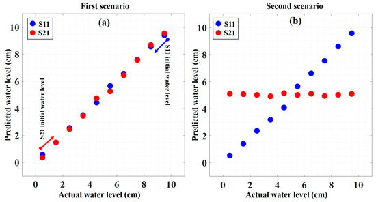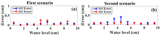 In Figure 7 the water level prediction error of both sensors versus the water level for each scenario is depicted. The blue and red colors show the error for the S11 and S21, respectively. As mentioned before, the bigger overlapping area in the second scenario makes prediction more challenging, thus the error in the second scenario increases slightly. The MAE for the S11 and S21 sensors for the first scenario is 0.0748 cm and 0.1063 cm, respectively. Hence, the total MAE for the first scenario can be calculated by averaging sensor errors, which for the first scenario is 0.0906 cm. For the second scenario, the MAE for the S11 and S21 for the first scenario are 0.1405 cm and 0.0693 cm, and the total MAE for this scenario is 0.1074 cm.