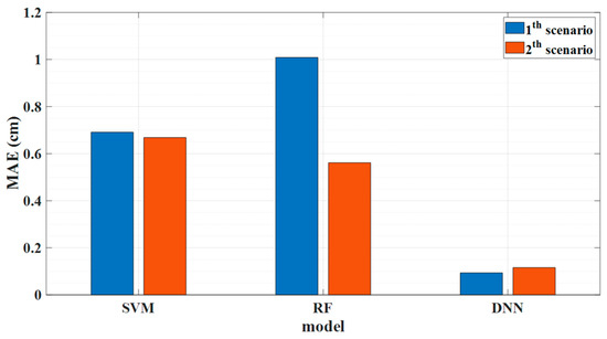 Depiction of the mean absolute error (MAE) of experimental results for the support vector machine (SVM), random forest (RF), and deep neural network (DNN) algorithm.