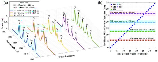 (a) The simulation results of reflected spectra of five water level sensors in five different water level steps, and (b) the predicted water level versus the actual water level of five sensors.