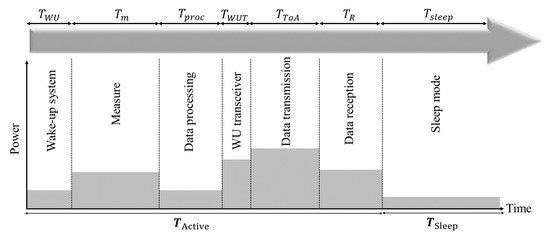 , describe the EC of the wake-up of the device, the data measurement, the microcontroller processing, the LoRa transceiver’s wake-up, the transmission, and the reception mode, respectively, as shown in