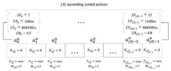 13]. Uniform probability initialization in such solutions as LoRa-MAB can take a long time to eliminate wrong choices from the actions, leading to increased convergence time. However, in LP-MAB, we do not assume an equal probability initialization for each action of an ED. Instead, we set the initial probabilities as an undefined number, i.e.,